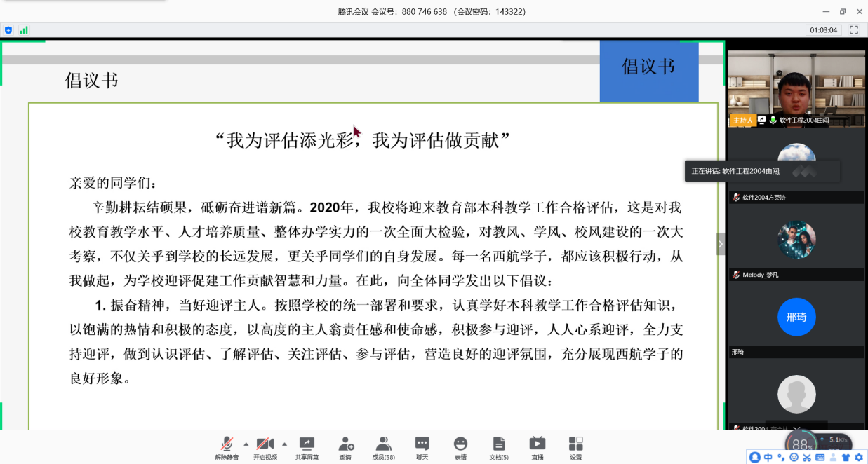 通过学习让学生了解了本科评估的背景、意义以及对于学生的影响,认识到了本科合格评估的重要性,同学们纷纷表示将努力向专家展现西航大学生奋发学习、朝气蓬勃的精神风貌。