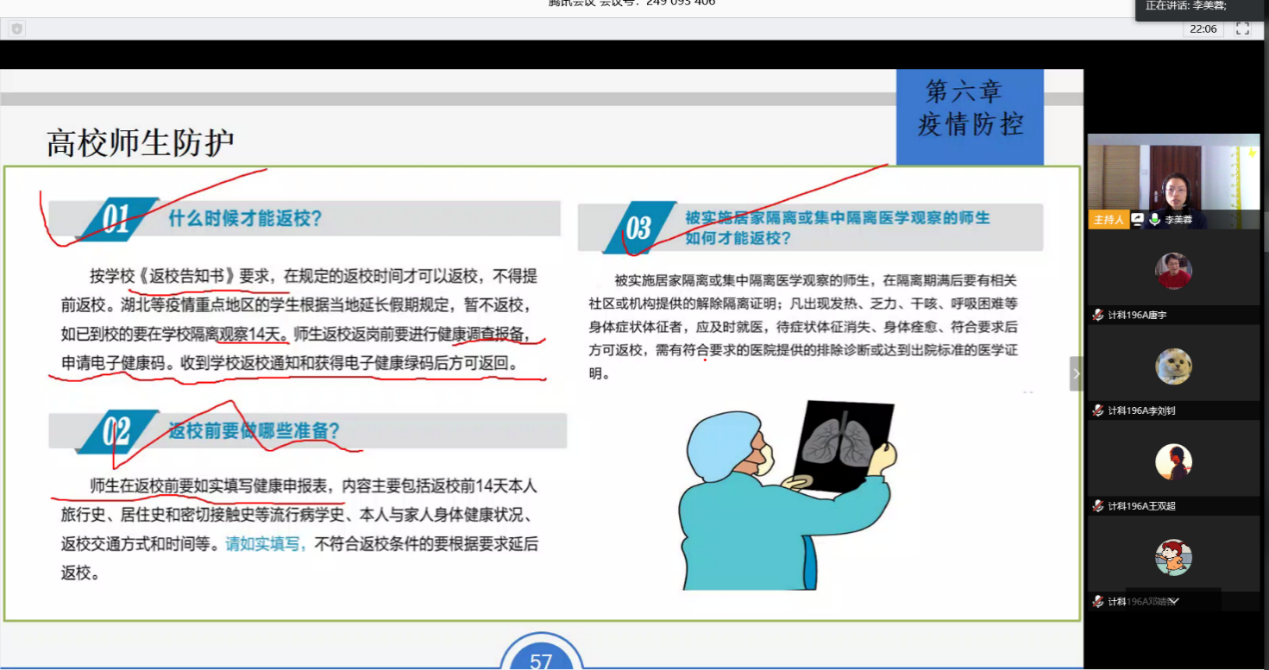 通过观看视频让学生了解了疫情发展的现状,同时班主任给大家讲明了教育厅关于复工复产复学的精神和学校的返校要求,要求大家本着对自己负责、对他人负责、对社会负责的原则,注重防护,严格遵守学校疫情期间的管理规定。