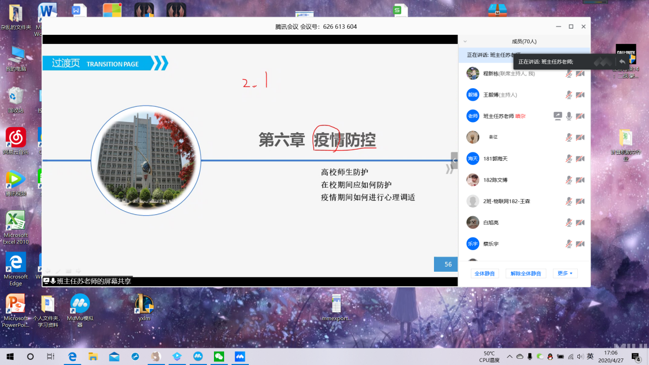 新葡萄官网AMG根据学校相关要求,制定了关于组织开展《2020年春季返校复学第一课》线上主题班会的实施方案,学院所有班级通过腾讯会议、QQ群课堂、腾讯课堂等线上平台于4月23日至5月7日全部完成了线上主题班会的学习和教育。
